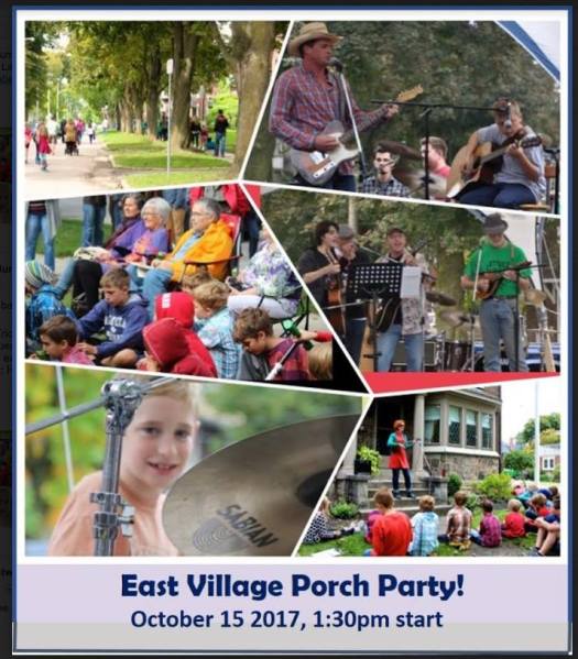 Posted on October 9, 2017 by auditoriumnaEast Village Porch Party – Oct. 15 1:30 pm Hello Neighbours, The Annual Neighbourhood Porch Party is coming on Sunday October 15th at 1:30 pm. Stay tuned for details about the exact schedule and locations Share this: Click to share on X (Opens in new window) X Click to share on Facebook (Opens in new window) Facebook Like Loading... Related